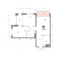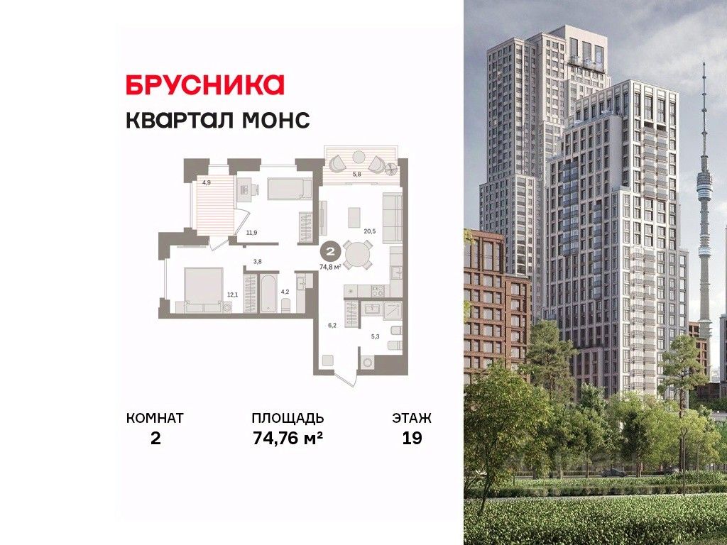 Квартира с кухней-гостиной и двумя спальнями в квартале "МОНС". Особенности планировки: второй санузел, тёплая лоджия, предчистовая отделка, балкон.