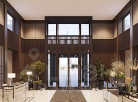 Зона ресепшн с витражным остеклением и переговорными комнатами.