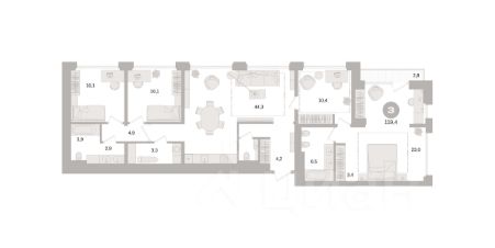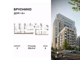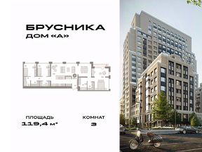 Квартира с кухней-гостиной и тремя спальнями в Доме "А". Особенности планировки: окна на две стороны, гардеробная, без отделки, вид во двор, разнесённые спальни, мастер-спальня, терраса, постирочная, терраса на крыше.