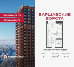 Продаются Апартаменты-студия 29.6 кв.м. в МФК "Варшавские ворота" на 3-м этаже 30 этажного дома. МФК "Варшавские ворота" — это проект, в котором учтен широкий спектр требований: от транспортной доступности и развитой инфраструктуры до архитектурной выразительности и экологического окружения.