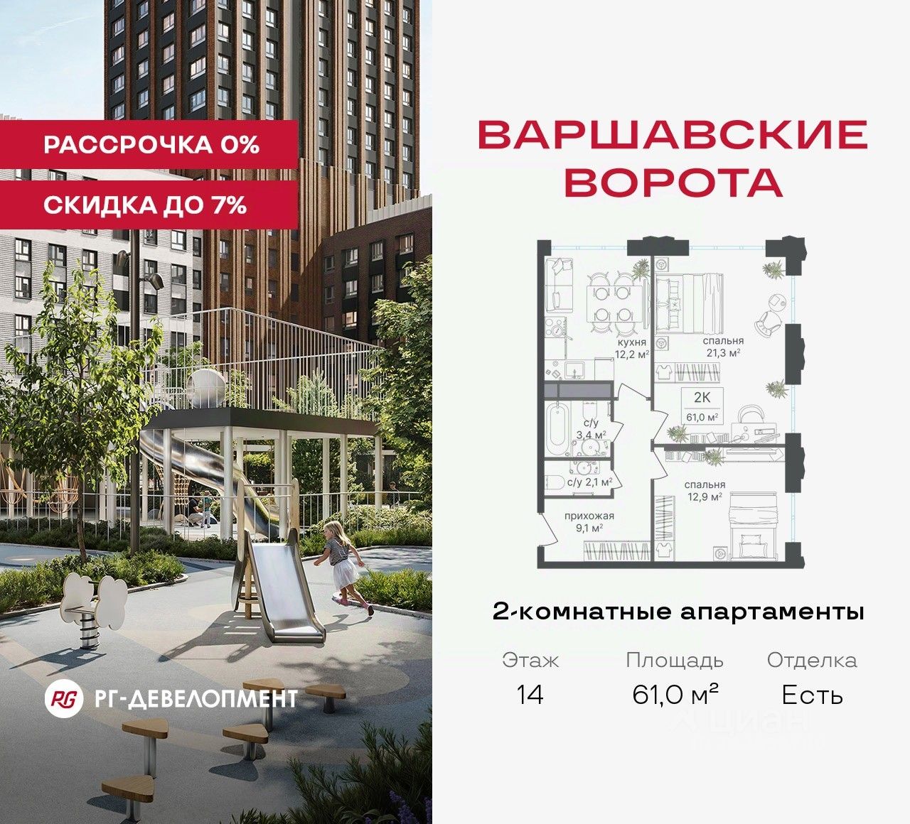 Продаются 2-комнатные апартаменты 61,0 кв.м. в МФК "Варшавские ворота" на 14-м этаже 30 этажного дома. МФК "Варшавские ворота" — это проект, в котором учтен широкий спектр требований: от транспортной доступности и развитой инфраструктуры до архитектурной выразительности и экологического окружения.