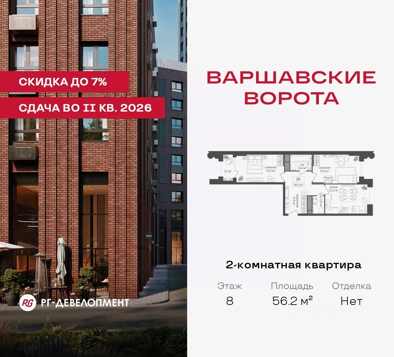 Продаётся 2-комнатная квартира 56.2 кв.м. в МФК "Варшавские ворота" на 8-м этаже 8 этажного дома. МФК "Варшавские ворота" — это точка баланса между природой и городом, стилем и функциональностью, жизнью сегодня и устойчивым будущим.