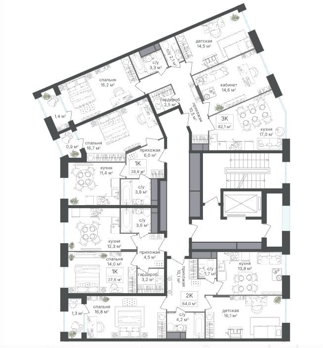 Среди планировочных решений представлены разнообразные форматы: от функциональных студий до просторных 4-комнатных квартир и апартаментов. Высокие потолки усиливают ощущение простора, а продуманные планировки включают мастер-спальни, гардеробные, угловые окна, объединённые кухни-гостиные и несколько санузлов.