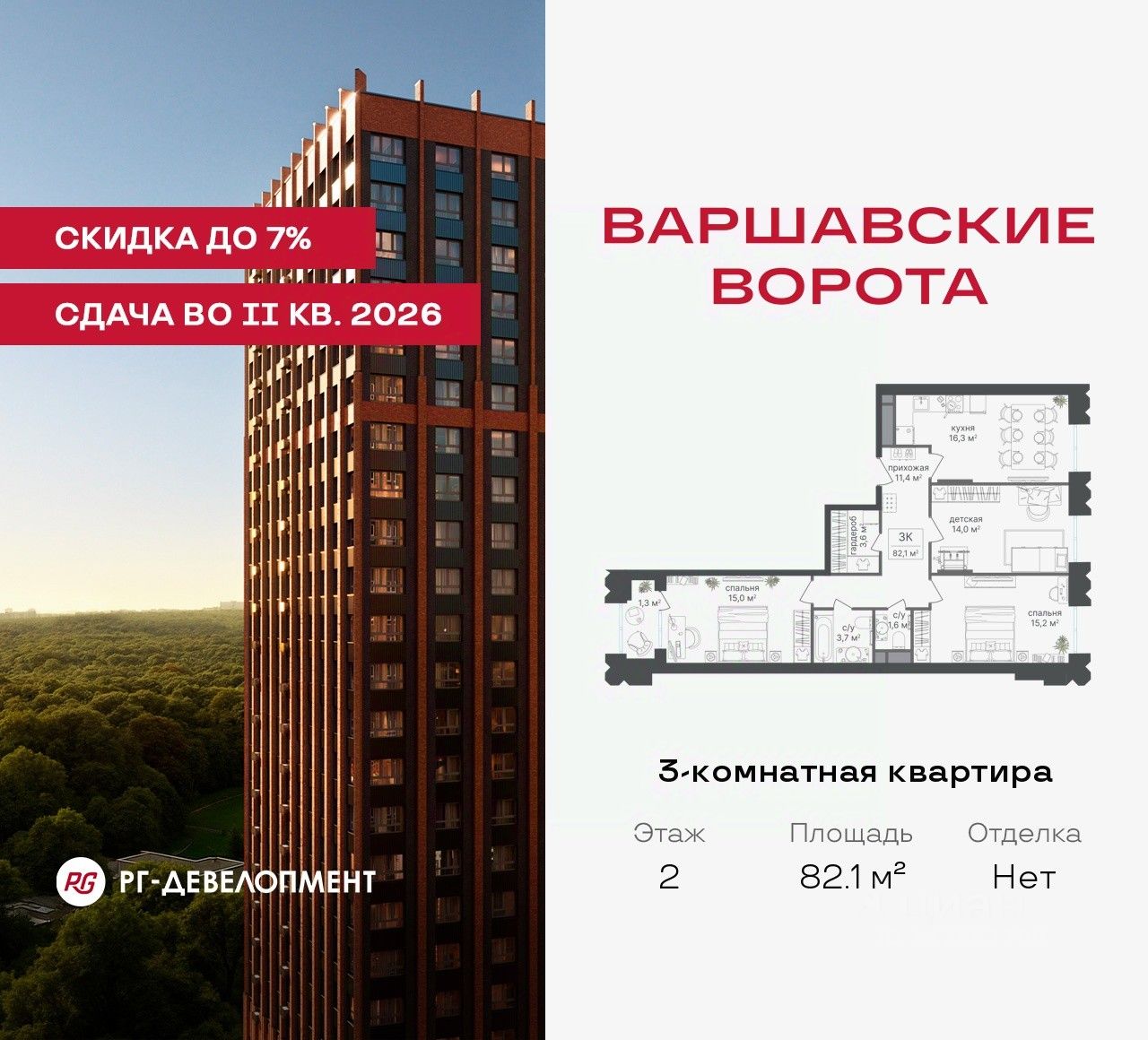 Продаётся 3-комнатная квартира 82.1 кв.м. в МФК "Варшавские ворота" на 2-м этаже 30 этажного дома. МФК "Варшавские ворота" — это точка баланса между природой и городом, стилем и функциональностью, жизнью сегодня и устойчивым будущим.