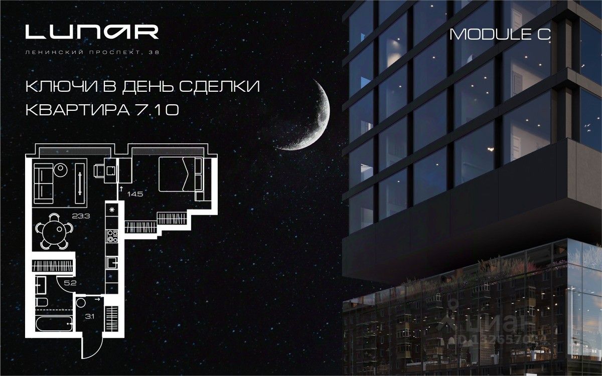 Новый дом на Ленинском проспекте! 1-комнатная квартира в сданном доме площадью 46,1 кв. метров с отделкой white box на 7 этаже комплекса премиум-класса LUNAR Module C: