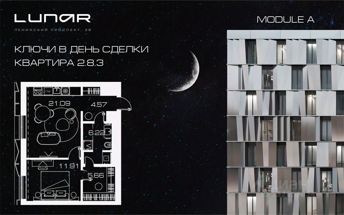 Квартира с 1-ой спальней общей площадью 51.1 кв. метров с отделкой white box на 8 этаже комплекса премиум-класса LUNAR: