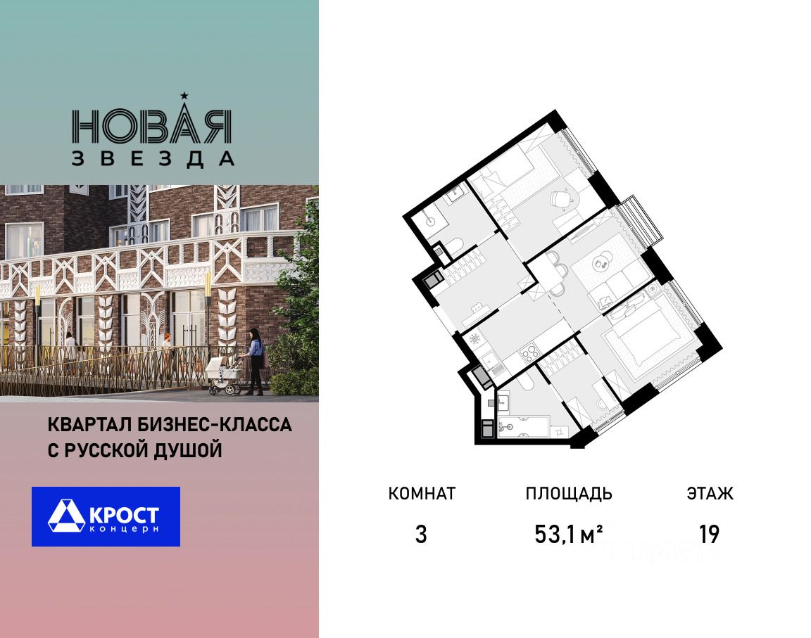 Продаётся 3-к квартира 53.1 кв.м. на 19-м этаже 21 этажного дома, корпус 1 - Резиденция "Вологда". Без отделки.