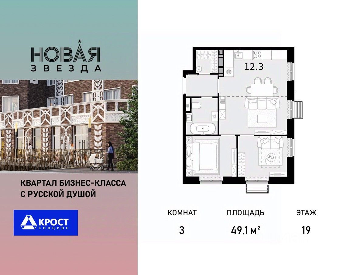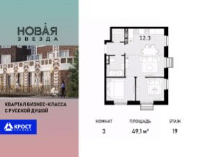Продаётся 3-к квартира 49.1 кв.м. на 19-м этаже 21 этажного дома, корпус 1 - Резиденция "Вологда". Без отделки.
