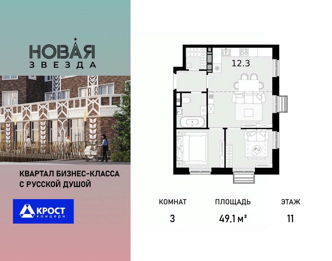Продаётся 3-к квартира 49.1 кв.м. на 11-м этаже 21 этажного дома, корпус 1 - Резиденция "Вологда". Без отделки.