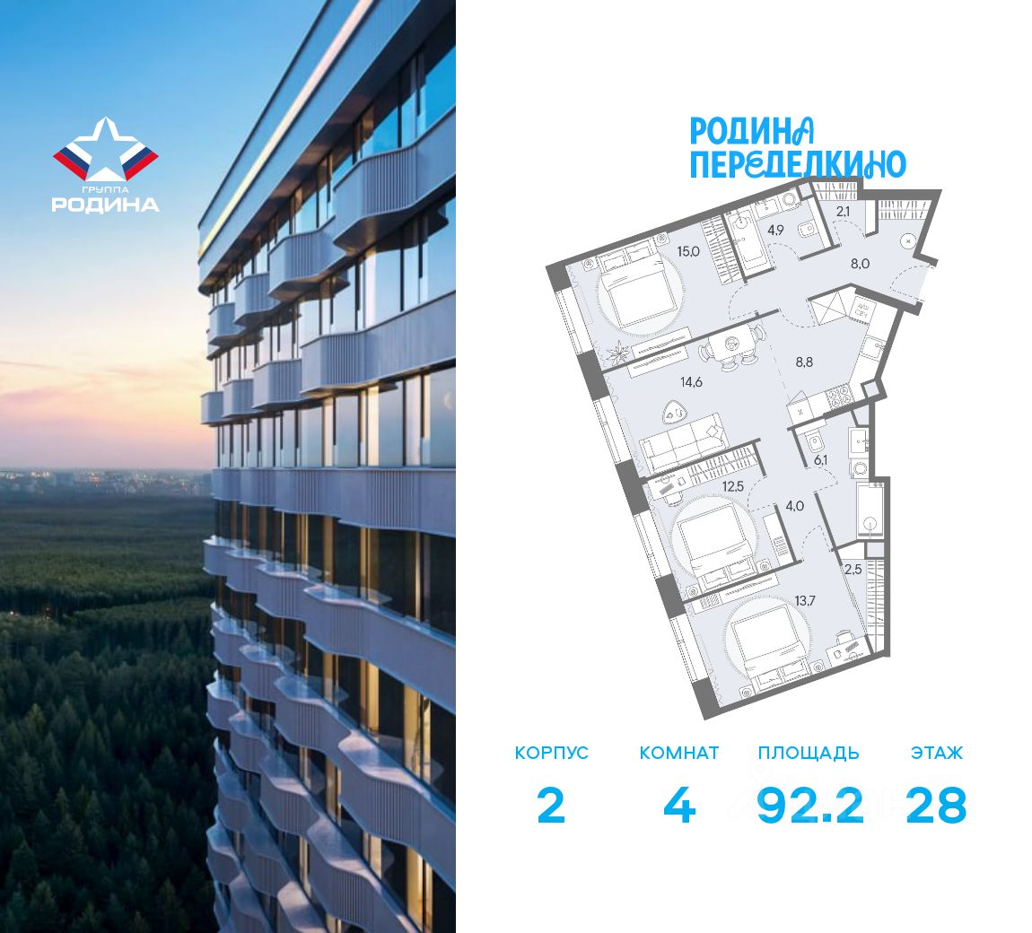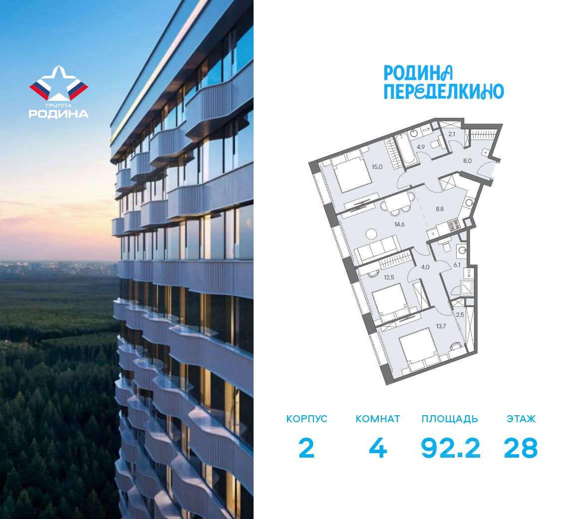 Продаётся 4-комнатная квартира площадью 92.2 м² на 28 этаже в Жилом Комплексе "Родина Переделкино".