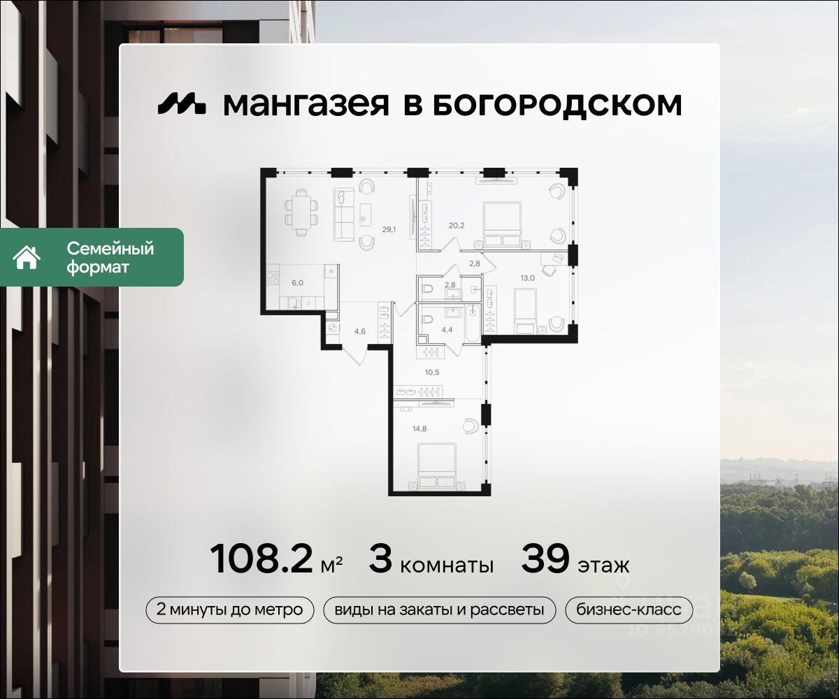 Предлагается квартира площадью 108.20 кв. м в новом современном квартале на востоке Москвы, прямо у станций метро и МЦК "Бульвар Рокоссовского". Квартира располагается в корпусе 5 на 39 этаже комплекса бизнес-класса "Мангазея в Богородском".