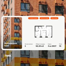 Продаётся 2-комн. квартира площадью 56,2 кв.м на 19 этаже 25 этажного дома (Корпус 18-20, Секция 1) проекта ПИК Люблинский парк. Светлый просторный подъезд на уровне земли, функциональная планировка, большие окна, c отделкой.
