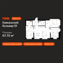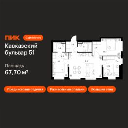 Продаётся 3-комн. квартира площадью 67,7 кв.м на 2 этаже 7 этажного дома (Корпус 3.7, Секция 4) проекта ПИК Кавказский бульвар 51. Светлый просторный подъезд на уровне земли, функциональная планировка, большие окна, предчистовая отделка.