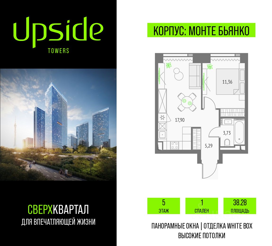 Продаётся 1-комнатная квартира площадью 38.28 кв.м на 5 этаже 46 этажного корпуса Монте Бьянко в квартале небоскребов "Upside Towers". В квартире отделка White-box, c видом на Звездный бульвар, Ольгинский храм, Останкинскую Башню. Номер квартиры Г0505.