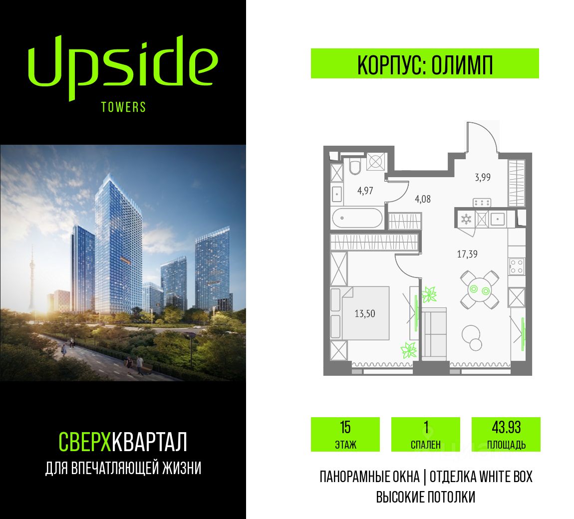 Продаётся 1-комнатная квартира площадью 43.93 кв.м на 15 этаже 19 этажного корпуса Олимп в квартале небоскребов "Upside Towers". В квартире отделка White-box, c видом на внутренний двор, ландшафтный парк. Номер квартиры В1511.