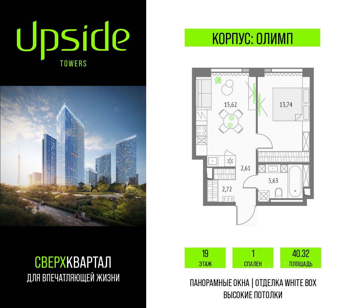 Апсайд Тауэрс - технологичный квартал строится в динамично развивающемся Бутырском районе, в 3 мин. от метро, в 5 мин. от ТТК. На территории 7 га возводится 5 высотных башен от 19 до 58 этажей, названных в честь главных вершин земли. Квартиры с панорамными окнами в пол, высокими потолками и современными инженерными решениями. Благоустроенная зеленая территория включает: приватные дворы, природный комплекс, прогулочный бульвар, ландшафтный парк 2,5 га с сенсорным садом и многофункциональными игровыми и спортивными площадками.