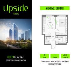 Продаётся 1-комнатная квартира площадью 40.32 кв.м на 19 этаже 19 этажного корпуса Олимп в квартале небоскребов "Апсайд Тауэрс", в квартире предчистовая отделка, c видом на корпус Эльбрус, Бизнес-парк Останкино, прогулочный бульвар, детский сад, школу. Номер квартиры В1903.