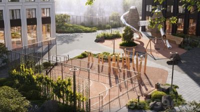 Во дворе комплекса "Мангазея в Богородском" будут места как для спокойного отдыха и работы, так и для игр и спорта. Здесь организованы игровые площадки для детей всех возврастов, места для стритбола и тенниса, а также зона с природным ландшафтом и коворкинг с экологичной деревянной мебелью.