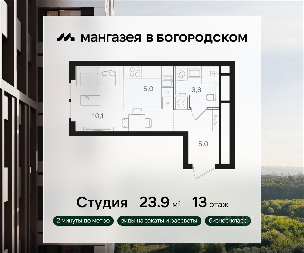 Предлагается квартира площадью 23.90 кв. м в новом современном квартале на востоке Москвы, прямо у станций метро и МЦК "Бульвар Рокоссовского". Квартира располагается в корпусе 2 на 13 этаже комплекса бизнес-класса "Мангазея в Богородском".