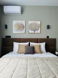 Апартаменты оформлены в дизайнерском стиле, что придаёт им уникальный и современный вид. Пространство организовано максимально эффективно, создавая уют и комфорт. В квартире есть совмещенный санузел, который выполнен с использованием качественных материалов.