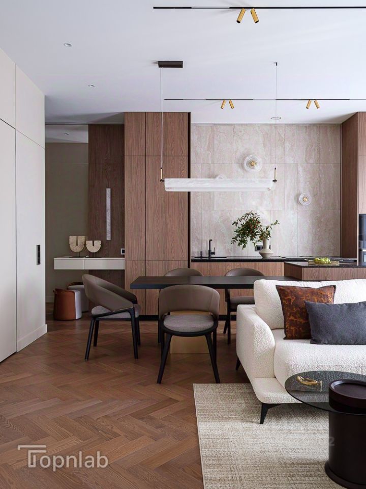 Эргономичная кухня-гостиная с мягкой зоной.