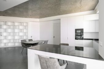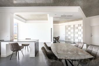 - Видовая гостиная с эркером, зона кухни с барной стойкой.