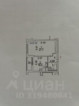 Планировка: Изолированная комната 21.1 м², кухня 10.2 м², совмещенный санузел 3.4 м², лоджия 1.5 м² (остеклена).