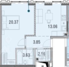 Планировка: Евро-формат — общая площадь: 43,1 кв.м. просторная кухня-гостиная: 13,06 кв.м. изолированная комната: 20,37 кв.м.