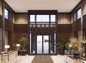Зона ресепшн с витражным остеклением и переговорными комнатами.