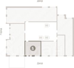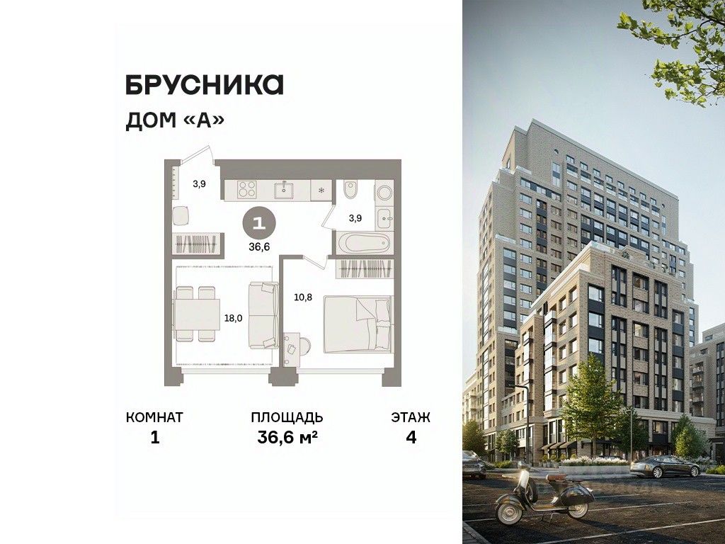 Квартира с кухней-гостиной и одной спальней в Доме "А". Особенности планировки: без отделки, вид во двор.