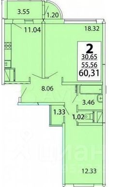 Планировка: две изолированные комнаты с окнами на разные стороны, просторная кухня с выходом на застекленный балкон, гардеробная, раздельный санузел, второй открытый балкон. Комнаты 18,3 и 12,3 кв.м, кухня 11 кв.м.