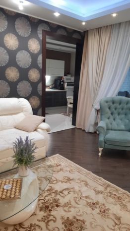 Внутреннее пространство выполнено с использованием только лучших материалов, что создает атмосферу уюта и роскоши. Полы украшены изысканным паркетом и керамической плиткой, а стены — аккуратной отделкой с современными декоративными элементами. Вся мебель в квартире — дорогая, стильная и полностью подобрана для максимального комфорта.