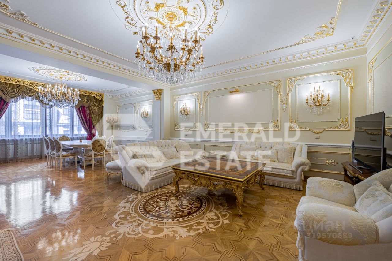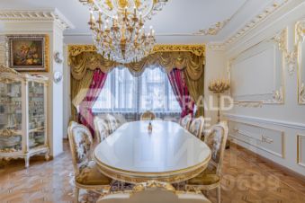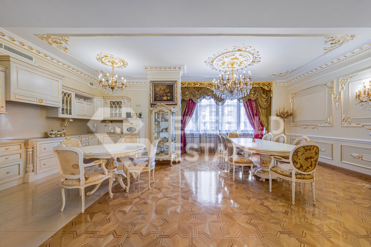 Каждый уголок этой квартиры оформлен с безупречным вкусом и вниманием к деталям. Здесь использованы только самые качественные и дорогие натуральные материалы. Итальянская мебель гармонично сочетается с элегантным мрамором и изысканным наборным паркетом, а хрустальные элементы и декор из сусального золота придают интерьеру неповторимый шарм. Шторы, изготовленные на заказ, добавляют уют и завершенность.