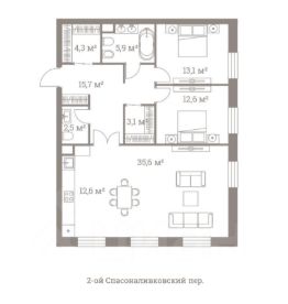 Планировочное решение: кухня-столовая-гостиная, 2 спальни, ванная комната, 2 гардеробные комнаты, гостевой с/у. Из квартиры открываются вид на 2-й Спасоналивковский переулок.
