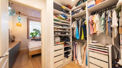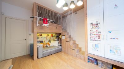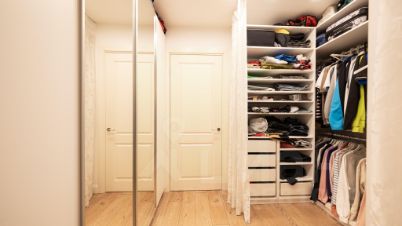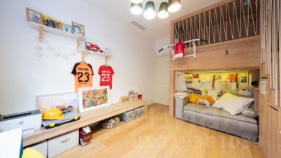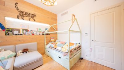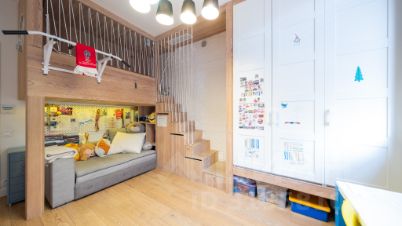 - В квартире есть спальня с гардеробной, кухня-гостиная, детская комната и кабинет.