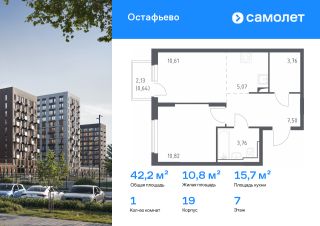 Предлагается 1-комнатная квартира комфорт-класса 42,16 кв.м в корпусе 19 на 7 этаже, в ЖК "Остафьево"