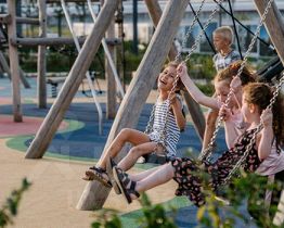 Все корпуса в квартале гармонично сочетаются, образуя единую городскую среду. Между собой их объединяет невысокая этажность и натуральная цветовая гамма. Здесь приятно гулять и проводить время на улице всей семьёй.