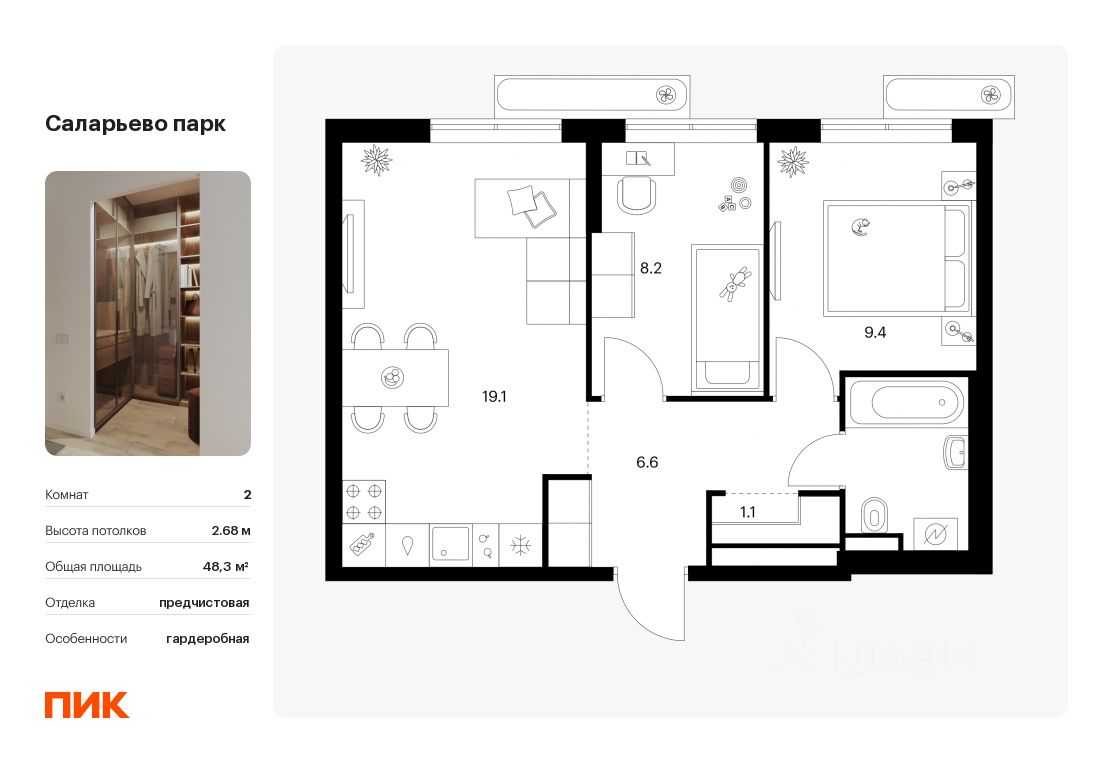Продаётся 2-комн. квартира площадью 48,3 кв.м на 14 этаже 16 этажного дома (Корпус 57.4, Секция 4) проекта ПИК Саларьево парк. Светлый просторный подъезд на уровне земли, функциональная планировка, большие окна, предчистовая отделка.