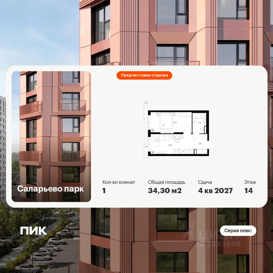 Продаётся 1-комн. квартира площадью 34,3 кв.м на 14 этаже 16 этажного дома (Корпус 57.4, Секция 4) проекта ПИК Саларьево парк. Светлый просторный подъезд на уровне земли, функциональная планировка, большие окна, предчистовая отделка.