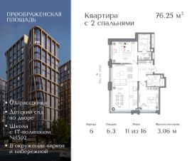 Квартира на 11 этаже в жилом комплексе премиум-класса "Преображенская площадь". Общая площадь: 76.25 кв.м.