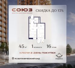 Продаётся 1-комнатная квартира площадью 45 м² на 16 этаже в Жилом Комплексе "Союз".