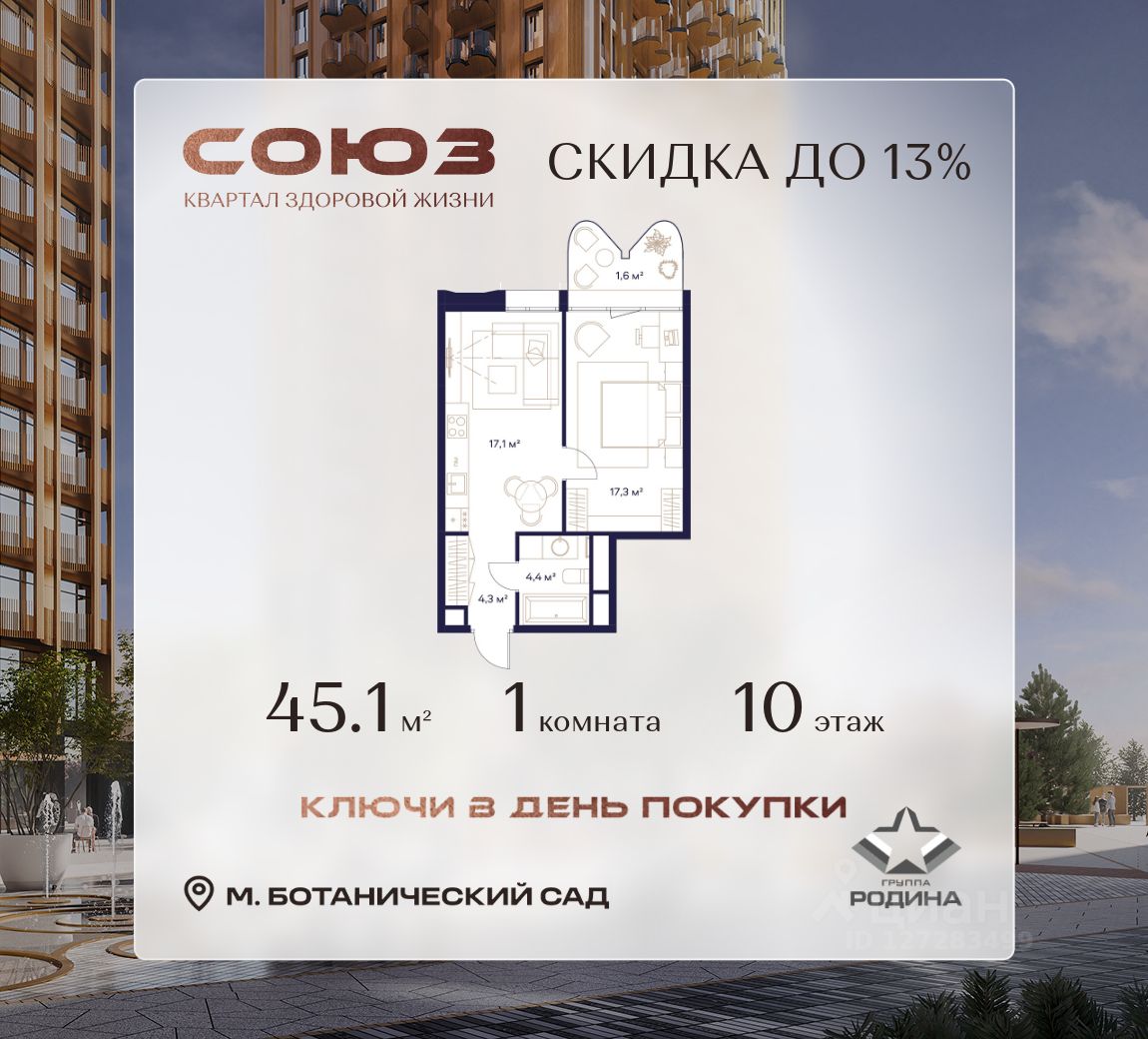 Продаётся 1-комнатная квартира площадью 45.1 м² на 10 этаже в Жилом Комплексе "Союз".