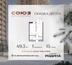 Продаётся 1-комнатная квартира площадью 49.3 м² на 15 этаже в Жилом Комплексе "Союз".
