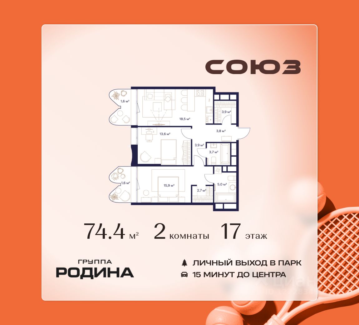 Продаётся 2-комнатная квартира площадью 74.4 м² на 17 этаже в Жилом Комплексе "Союз".
