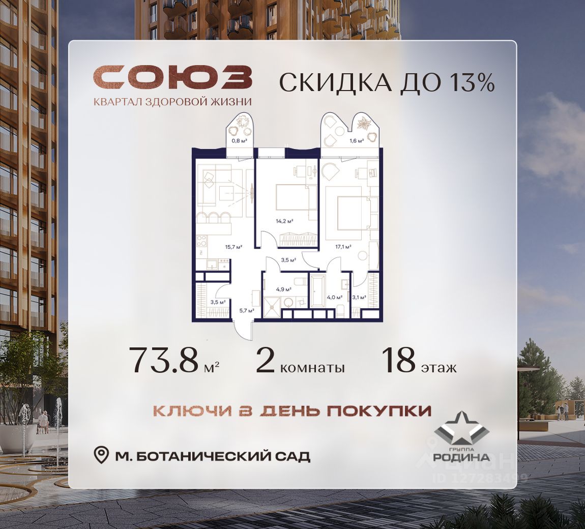 Продаётся 2-комнатная квартира площадью 73.8 м² на 18 этаже в Жилом Комплексе "Союз".