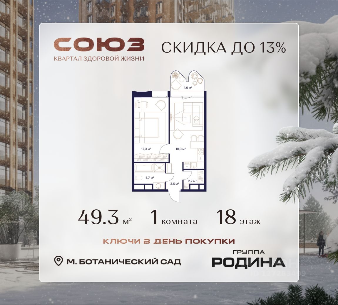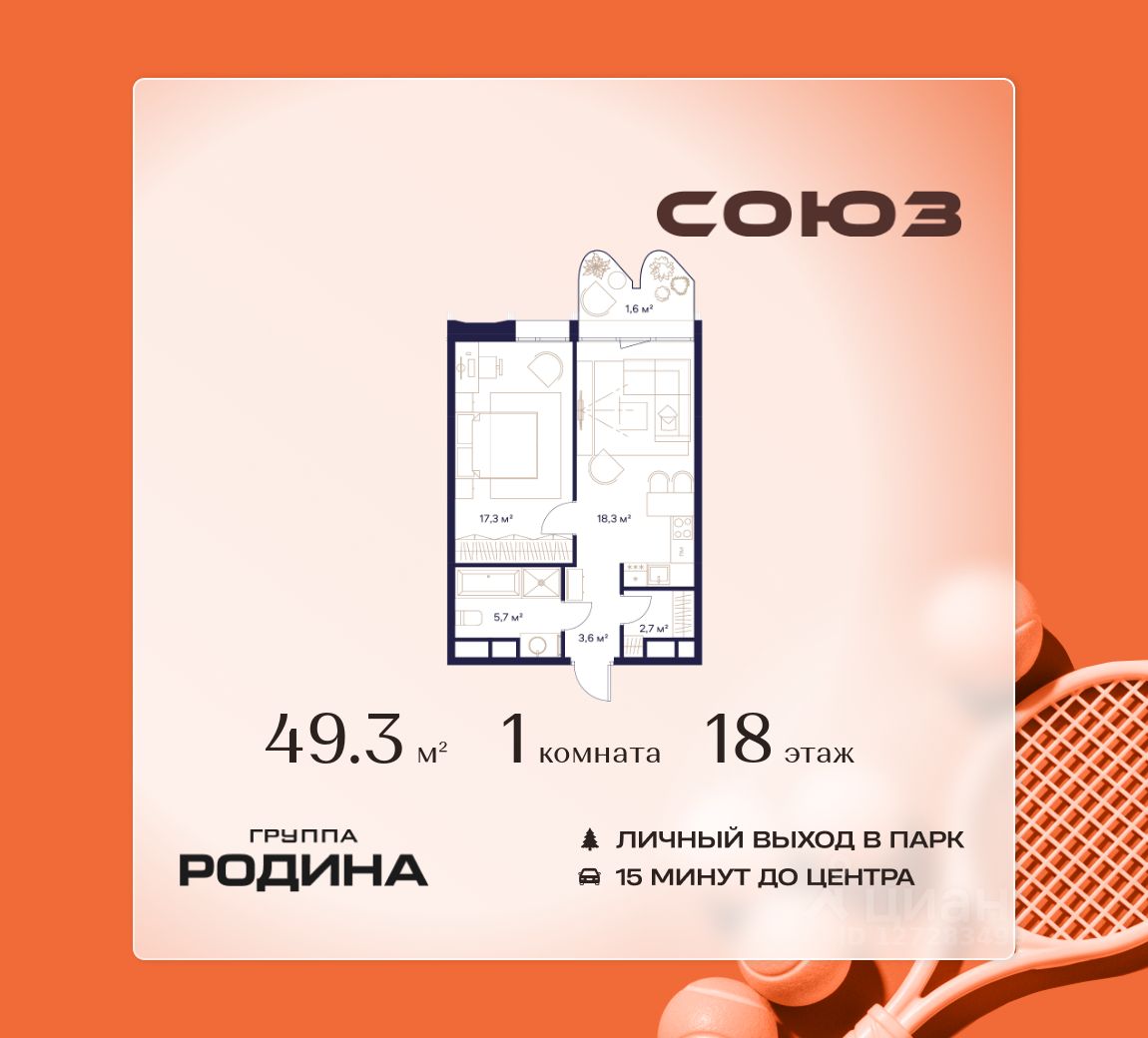 Продаётся 1-комнатная квартира площадью 49.3 м² на 18 этаже в Жилом Комплексе "Союз".