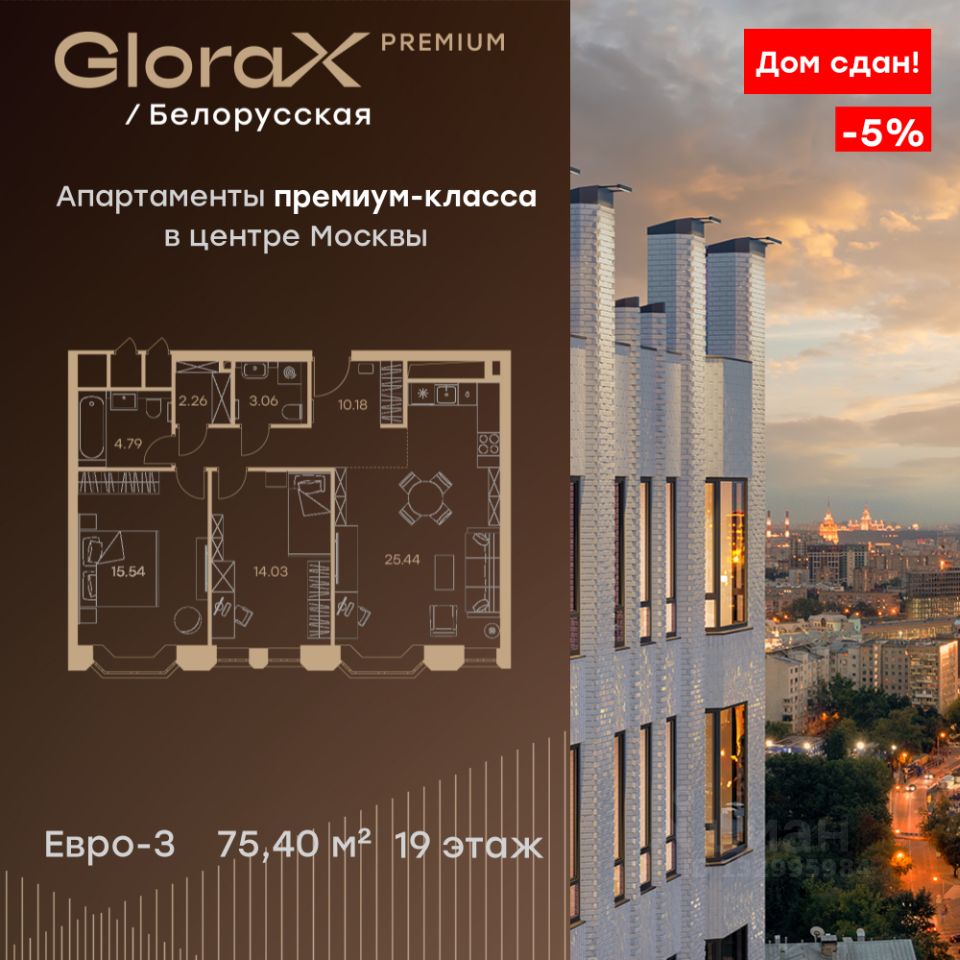Продается 2-комн. апартамент на 19-м этаже в клубном доме премиум-класса GloraX Premium Белорусская. Общая площадь лота составляет 75,30 кв. м, из которых 29,57 кв. м отведено под жилую зону. Номер апартамента - 174. Цена лота указана с учетом НДС.