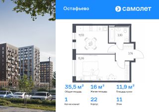 Предлагается 1-комнатная квартира комфорт-класса 35,51 кв.м в корпусе 22 на 11 этаже, в ЖК "Остафьево"