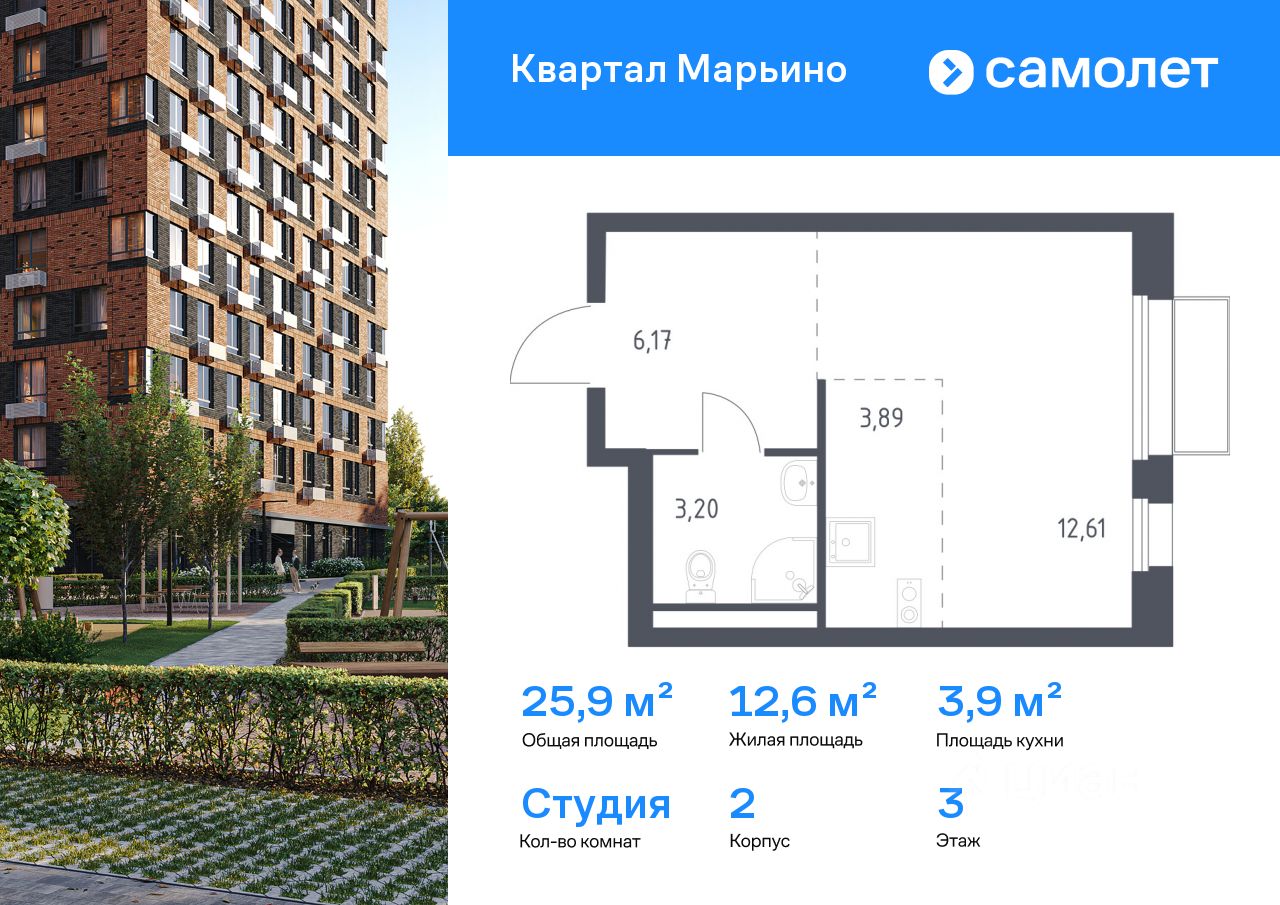 Предлагается квартира студия комфорт-класса 25,87 кв.м в корпусе 2 на 3 этаже, в ЖК "Квартал Марьино"