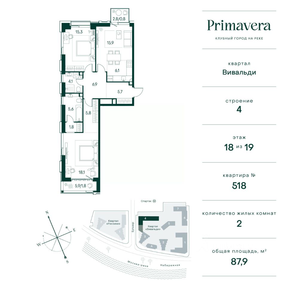 Клубный город на реке Primavera — это респектабельный проект премиум-класса на первой береговой линии Москвы-реки в экологически безупречном районе — Покровское-Стрешнево. Под панорамными окнами квартир расположился собственный экопарк, площадью 12 гектаров с сетью прогулочных дорожек, оборудованный детскими и спортивными площадками, а за ним набережная с собственным пляжем и зонами отдыха. Клубный город на реке Primavera предлагает впечатляющий выбор планировок для любого жизненного сценария: от просторных однокомнатных квартир до пентхаусов и квартир с видовыми террасами или патио. Выбирайте из 120 вариантов эргономичных планировок стандартного и евроформата. В проекте доступны квартиры площадью от 40 до 209 м², в каждой из которых открываются непревзойденные виды на реку, а угол обзора составляет 270 градусов. Из дизайнерских лобби открывается панорамный обзор на зеленый благоустроенный двор. Статусное мебелирование, потолки высотой 6 м и комфортная лаунж-зона отсылают к стилистике высококлассных пятизвездочных отелей. В Primavera есть все, что может предложить мегаполис, здесь все сосредоточено вокруг вас и настроено на ваши желания: - Всестороннее детское развитие в паре шагов от дома: 4 школы, 8 детских садов, развивающие центры с кружками и секциями. - Комфорт мегаполиса на расстоянии приятной прогулки: супермаркеты, кафе, рестораны с верандами на крыше, салоны красоты, аптеки, компании сферы услуг, многофункциональный центр для шоппинга и развлечений. - Умный дом: автоматизированное бесконтактное управление основными системами доступа, инфраструктуры и безопасности через мобильное приложение и специальные метки. Клубный город на реке Primavera выгодно отличается близостью к природе, совмещенной с насыщенной инфраструктурой.